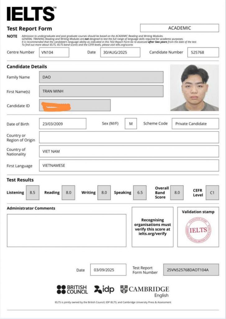 IELTS 8.0 mở ra trước mắt Minh nhiều cơ hội học tập, định hướng nghề nghiệp và cả những cánh cửa quốc tế. ![]()